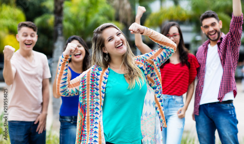 Jubelnde Frau mit blonenden Haaren und anderen Jugendlichen