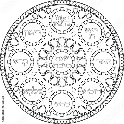Judaica Rosh Hashanah simanim plate decorative illustration with Hebrew titles. Jewish art black linear traditional seder platter. Judaism coloring page. Translation: "A good year"