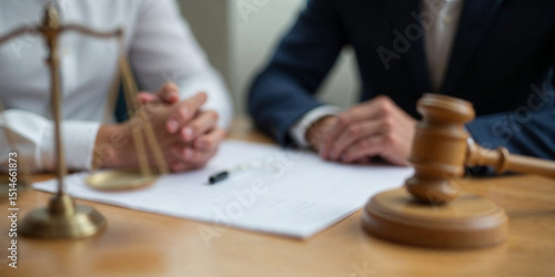 Judge gavel with Justice lawyers having team meeting at law firm background. Concepts of Law and Legal services.