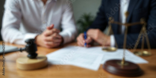 Judge gavel with Justice lawyers having team meeting at law firm background. Concepts of Law and Legal services.