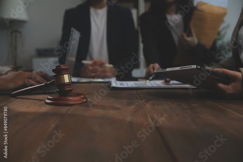 Judge gavel with Justice lawyers having team meeting at law firm background. Concepts of Law and Legal services.
