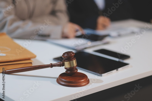 Judge gavel with Justice lawyers having team meeting at law firm background. Concepts of Law and Legal services.