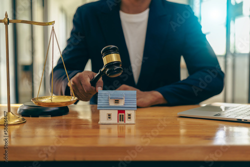 Judge holding sledgehammer and laptop house, concept of real estate auction or house division upon divorce division of property Real estate by the legal system .