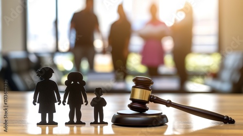 Judge in courtroom reviewing adoption papers with a family nearby. Society, child welfare institutions, family happiness, family affection, legal aid, justice, family unity