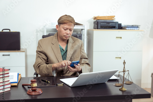 Judge, male lawyer discuss legal services for businessmen, give advice on contracts, plan court cases.