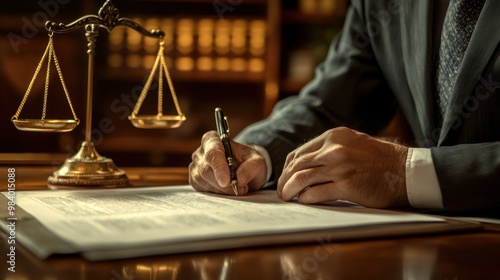 Judge Signing Legal Documents in Formal Office Chambers with Scales of Justice