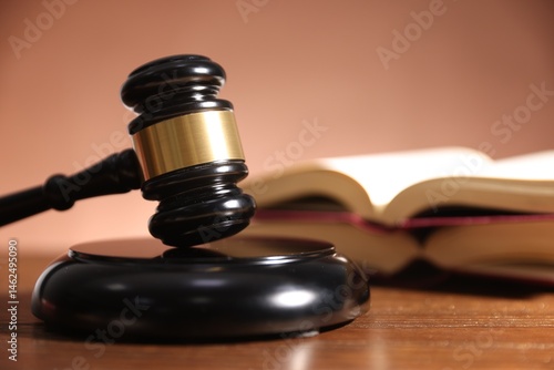 Judge's gavel, sound block and books on wooden table against pale brown background, closeup