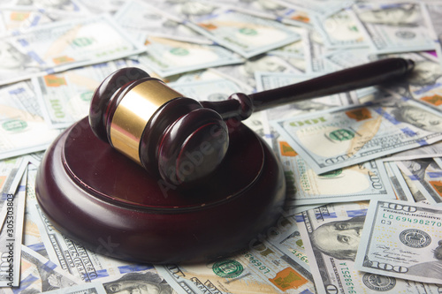 Judges Or Auctioneer Gavel On The Dollar Cash Background, Top View, Close-Up. Concept For Corruption, Bankruptcy, Bail, Crime, Bribing, Fraud, Auction Bidding, Fines