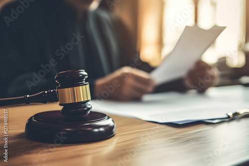 Judge’s wooden gavel on a courtroom desk with a blurred background of legal documents