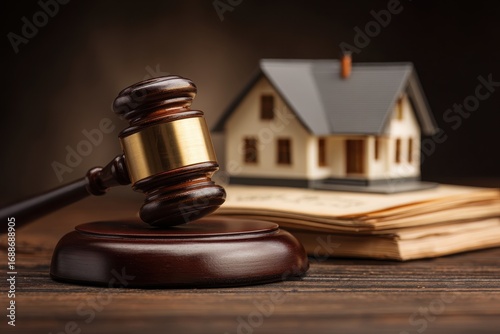 Judicial Auction Scene: Justice and Real Estate in Court with Gavel and House Imagery
