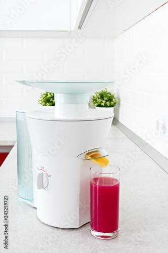 Juicer with a glass of red fresh juice in a modern kitchen.