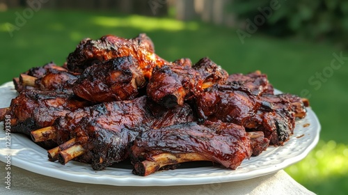 Juicy barbecue ribs glazed with sauce on a white plate outdoors