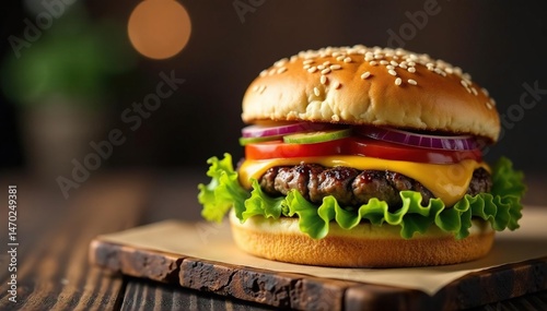 Juicy beef burger on a sesame seed bun with lettuce, tomato, and onion , classic, lunch, summer