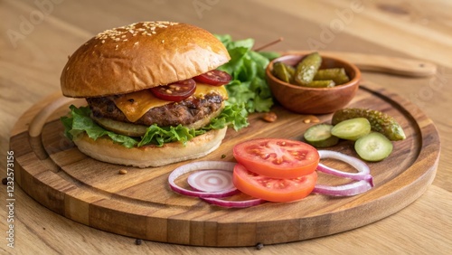 Juicy Beef Burger on Wooden Board with Fresh Tomato and Onion Slices