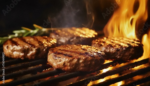 Juicy beef hamburger patties sizzling over hot flames on the grill