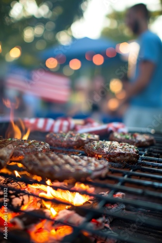 Juicy burgers being grilled over an open flame at an outdoor summer barbecue with friends in the background. Generated AI