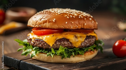 Juicy Cheeseburger on Wooden Board