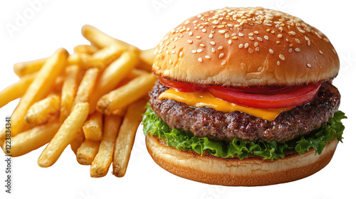 Juicy Cheeseburger with Crispy Fries: A mouthwatering classic cheeseburger, perfectly cooked patty, melted cheese, fresh lettuce and tomato, served with a side of golden crispy french fries.