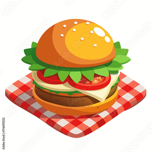Juicy cheeseburger with fresh toppings on a red gingham blanket silhouette
