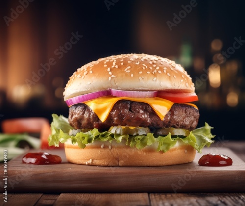 Juicy Cheeseburger with Lettuce Tomato and Cheese on Wooden Board