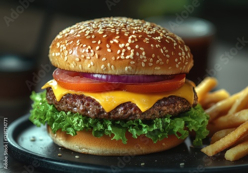 Juicy cheeseburger with melted cheddar, fresh lettuce, tomato, red onion, served alongside crispy French fries on a rustic wooden table