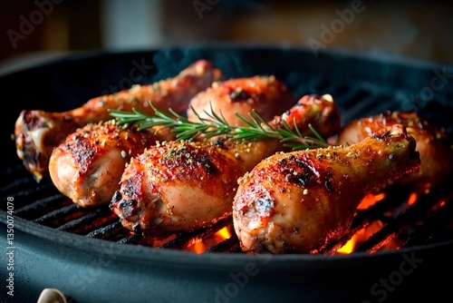Juicy chicken drumsticks are sizzling on a charcoal grill, imparting a smoky flavor. Fresh herbs enhance the essence, while flames dance under the meat in a relaxed summer evening atmosphere