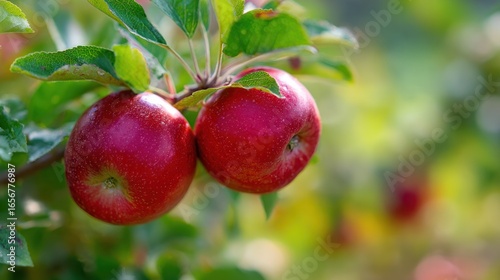 Juicy Duo: Two ripe, ruby-red apples hang gracefully on a tree branch, radiating freshness. The vivid detail of each apple.