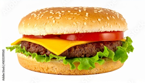 Juicy gourmet cheeseburger with fresh lettuce, tomato, and melted cheddar on a sesame seed bun