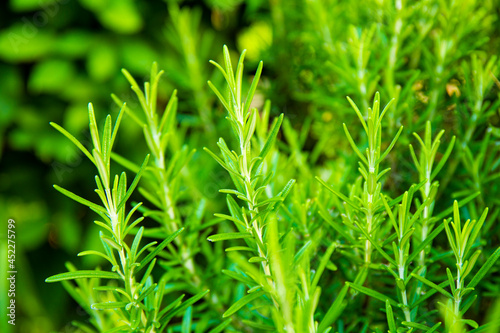 Juicy green rosemary growing in the garden in summer on a sunny day