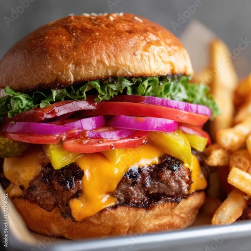 Juicy grilled beef cheeseburger with melted cheddar, red onion, tomato, lettuce, and pickles, served on a brioche bun with french fries. : Generative AI