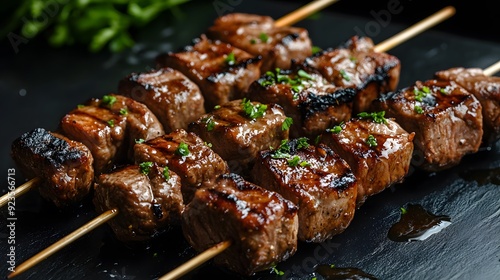 Juicy grilled beef kebabs, skewers of marinated meat chunks, caramelized glazed surface, green herb garnish, close-up detailed food photography, black marble table background.