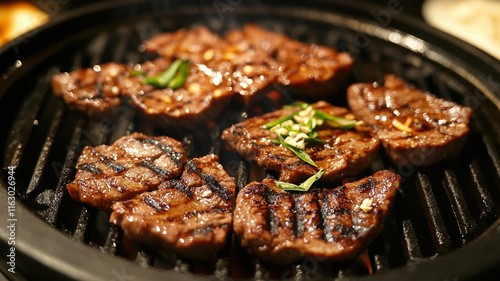 Juicy Grilled Beef Steaks with Fresh Herbs and Spices on Cast Iron Pan