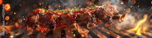 Juicy grilled meat garnished with herbs, sizzling over flames, perfect for barbecue lovers and food enthusiasts.