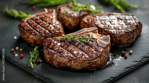 Juicy Grilled Ribeye Steaks on a Slate Platter Surrounded by Fresh Herbs and Seasonings Perfect for Culinary Photography, Food Blogs, and Cookbooks