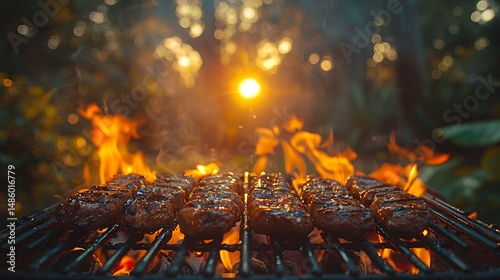 Juicy grilled sausages sizzling over an open flame at sunset during a summer barbecue outdoors