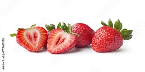 Juicy halved strawberries with water drops on a white background, perfectly fresh and vibrant