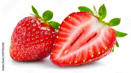Juicy halved strawberry and whole strawberry, isolated on white background, perfect for food blogs or recipe websites