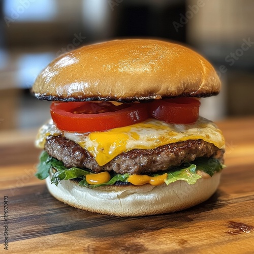 Juicy hamburger with fresh toppings and melted cheese on a wooden table in a bright kitchen setting. Generative AI