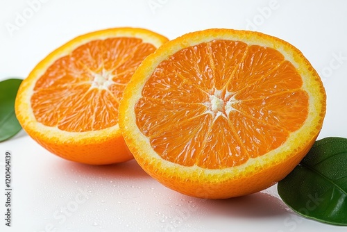 Juicy orange halves, leaves, white background; healthy food photography