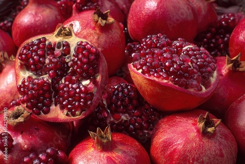 juicy pomegranates bursting open revealing vibrant red seeds inside