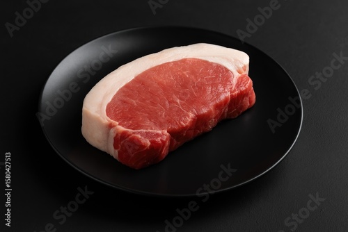 Juicy pork steak with rendered fat served on a dark dinner plate