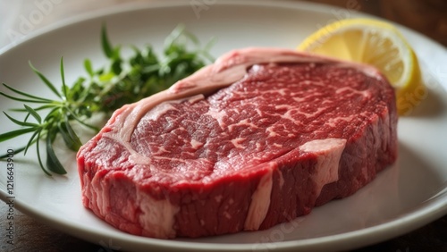 Juicy raw ribeye steak with herbs and lemon on a white plate ready for grilling
