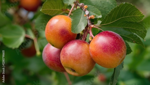 Juicy red and orange apples hanging from a green leafy branch, showcasing natural beauty in a bright sunny orchard. Vivid colors and fresh look.