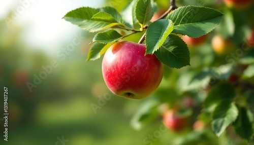 Juicy Red Apple Hanging on Branch in Orchard