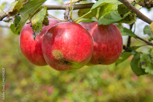 Juicy ripe sweet red apples growing on a branch in a sunny orchard