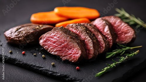 Juicy Sliced Beef Steak with Carrots on Slate Background