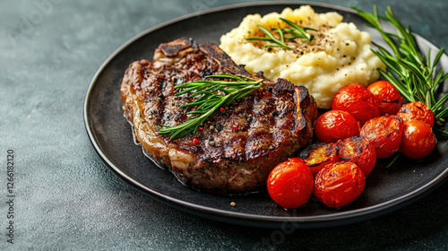Juicy Steak with Grilled Vegetables and Mashed Potatoes