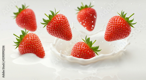 Juicy strawberries splashing into creamy milk, a delightful burst of summer freshness in vibrant red and white.