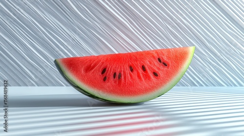 Juicy watermelon slice on white striped background.