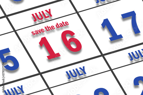 july 16th. Day 16 of month, Date marked Save the Date on a calendar. summer month, day of the year concept